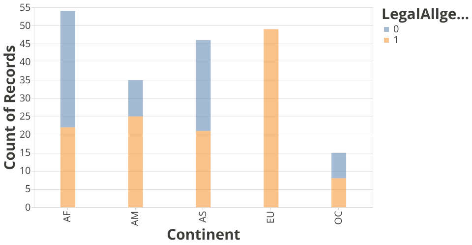 A visualization constructed using the vega-lite-api that shows the number of positive and negative LGBTQI laws in different contients.