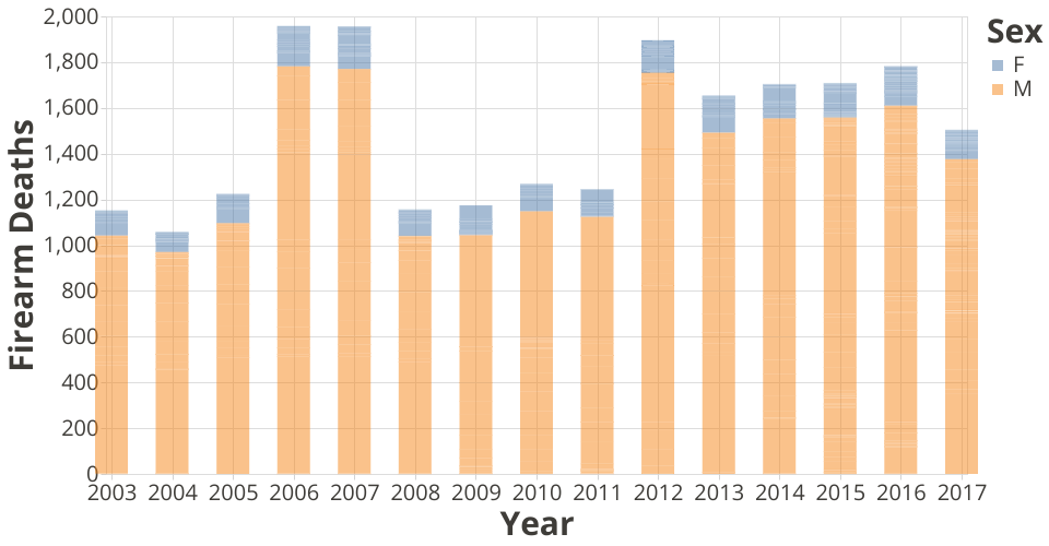 A visualization constructed using the vega-lite-api that shows the number of male and female firearm deaths from 2003-2017.