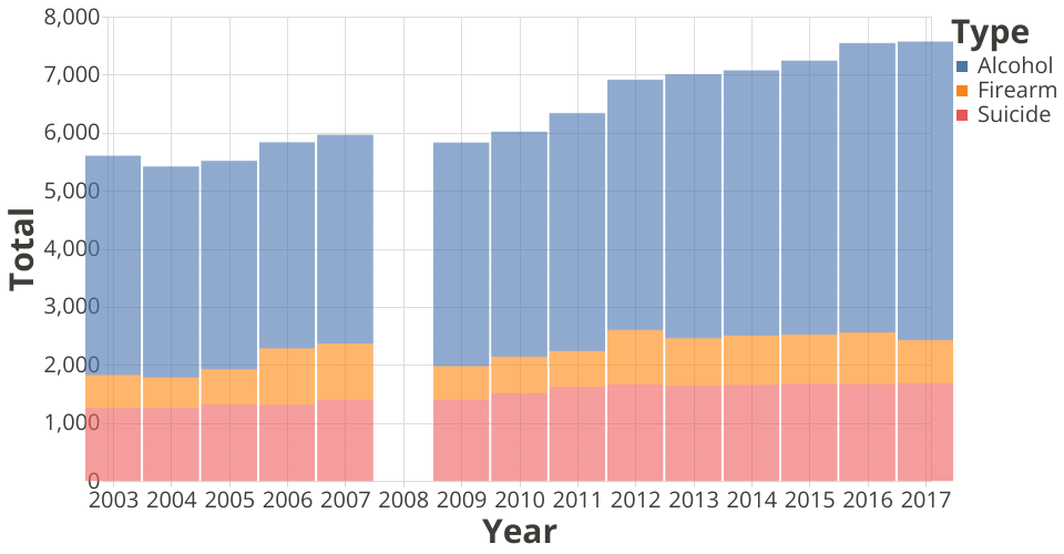 Observations: We can see that the total number of deaths goes up over time. We can also see that there are consistently more deaths from alcohol than suicide, and suicide than firearms. More questions can be asked on the breakdown of these deaths.