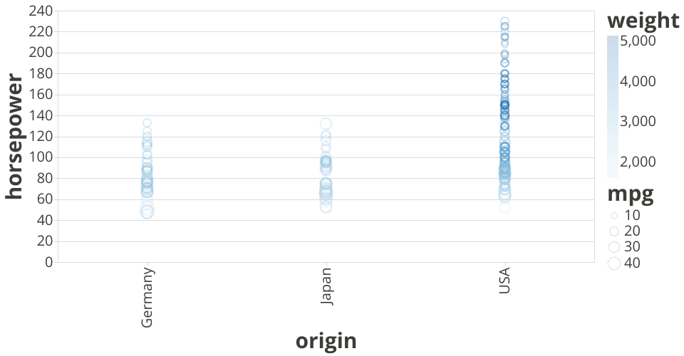 The data shown here comes from the UCI Machine Learning Repository: Auto MPG Data Set, via Gist: Scatter Plot with Menus.