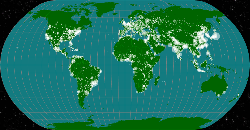 Using React, D3, and World Atlas' TopoJSON data to display the world's most populous cities.