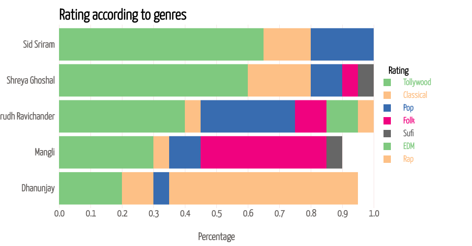Tollywood Singers Genre Dataset This dataset presents a breakdown of diverse Tollywood singers and their association with one of a kind music genres, consisting of Bollywood, Classical, Pop, Folk, Sufi, EDM, and Rap. Each singer is represented with the aid of numerical values indicating their affinity for each style. The values variety from 0 to at least one, in which better values advocate a more potent connection. This dataset may be used for analysis in track class, recommendation systems, or to discover traits in Tollywood music.