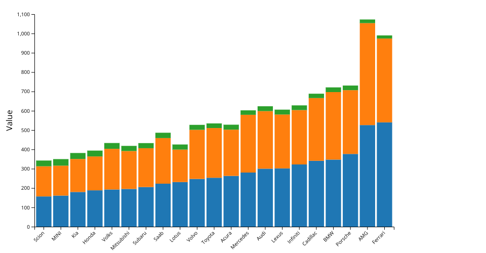 This stacked bar chart gives the percentage of each rating level within different movie genres. The aim is to show the impact of genre on movie ratings. When the mouse hovers over each bar, you can see pop-ups of accurate percentage of each rating level within each genre. Total percentage is 1, representing 100%.
