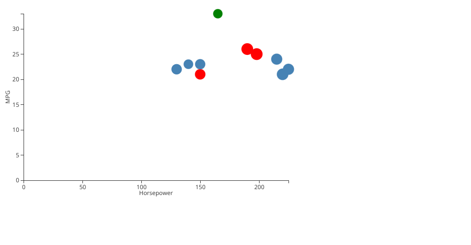 This HTML file creates an interactive scatter plot using D3.js library to visualize data points from the Cars dataset. It displays the relationship between horsepower and MPG (miles per gallon) of cars, with additional information such as origin and weight. Each data point is represented by a circle, with size corresponding to weight, and color indicating the origin of the car (USA, Japan, or Europe).