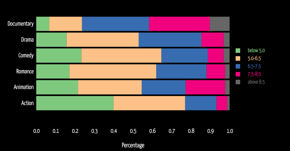 This stacked bar chart gives the percentage of each rating level within different movie genres. The aim is to show the impact of genre on movie ratings. When the mouse hovers over each bar, you can see pop-ups of accurate percentage of each rating level within each genre. Total percentage is 1, representing 100%.