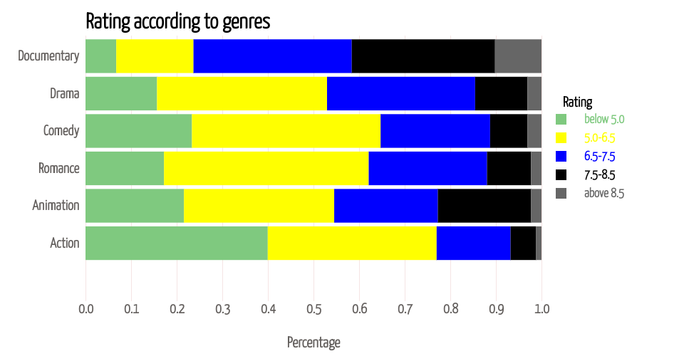 This stacked bar chart gives the percentage of each rating level within different movie genres. The aim is to show the impact of genre on movie ratings. When the mouse hovers over each bar, you can see pop-ups of accurate percentage of each rating level within each genre. Total percentage is 1, representing 100%.