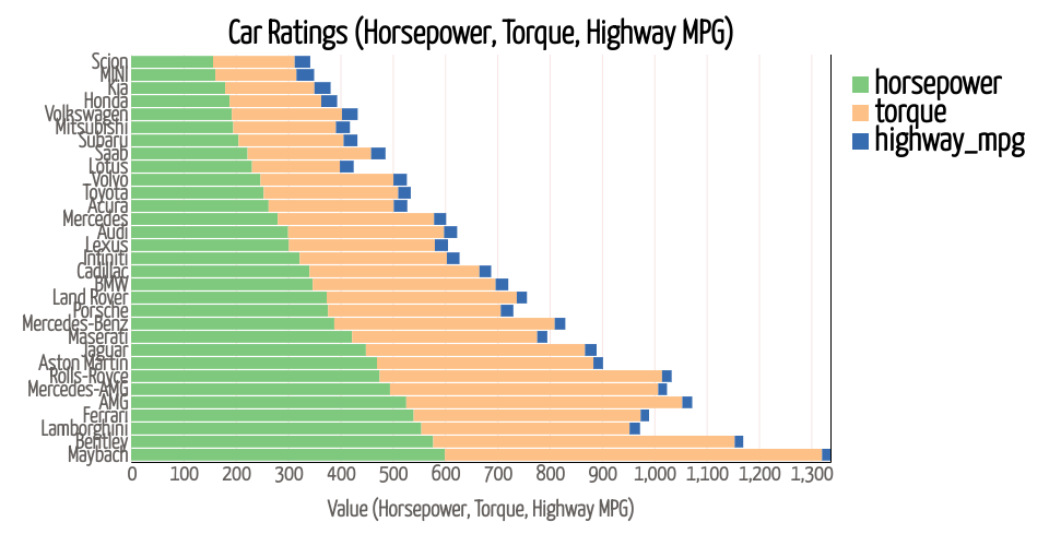 This stacked bar chart gives the percentage of each rating level within different movie genres. The aim is to show the impact of genre on movie ratings. When the mouse hovers over each bar, you can see pop-ups of accurate percentage of each rating level within each genre. Total percentage is 1, representing 100%.