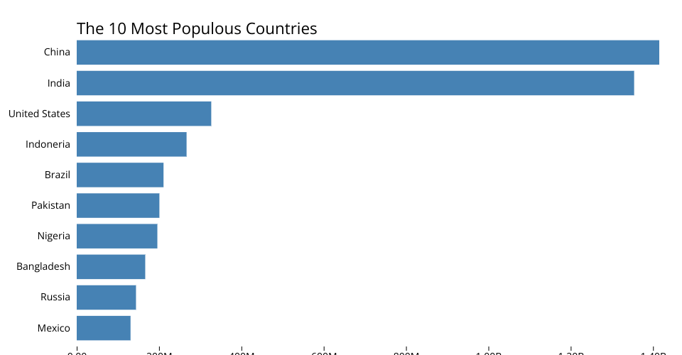 This bar chart show the populate of the 10 most populous contries. The data come from year 2018 estimate in World Population Prospects 2017