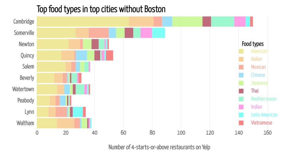 Stacked bar chart of Yelp data: top cities