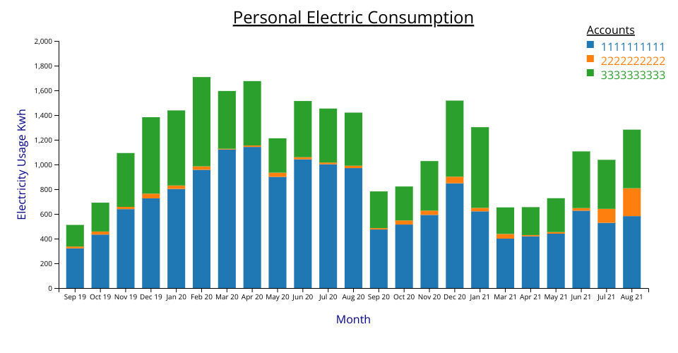 A bar chart visualization of my personal electricity consumption dataset. I live in a three family structure and occupy two floors. There is also a common account that supplies the front and back hall lighting as well as the basement and exterrior outlets. It covers a period of two years.