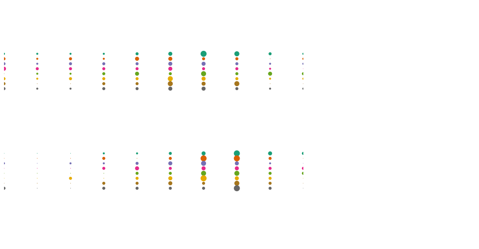 This scatterplot has two groups of circles divided on the y-axis depending on a variable in the data