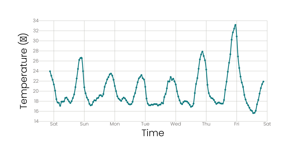 Line chart showing tempature change over time [San Francisco Temp] (https://gist.githubusercontent.com/curran/90240a6d88bdb1411467b21ea0769029/raw/7d4c3914cc6a29a7f5165f7d5d82b735d97bcfe4/week_temperature_sf.csv)