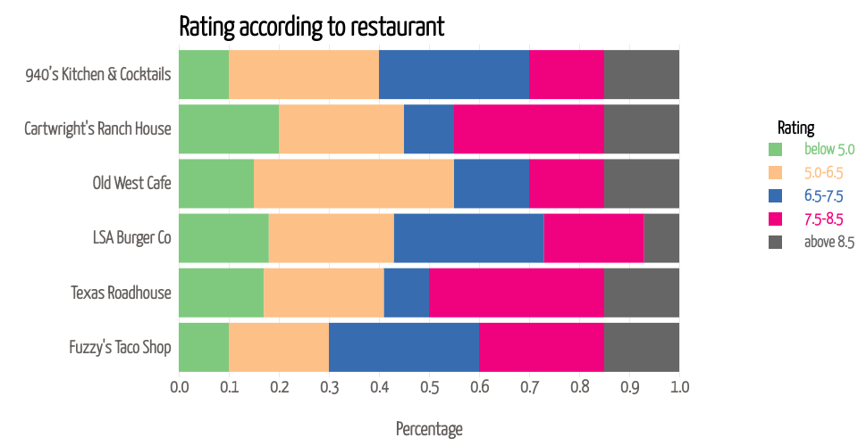 This stacked bar chart gives the percentage of each rating level across 7 different restaurants.