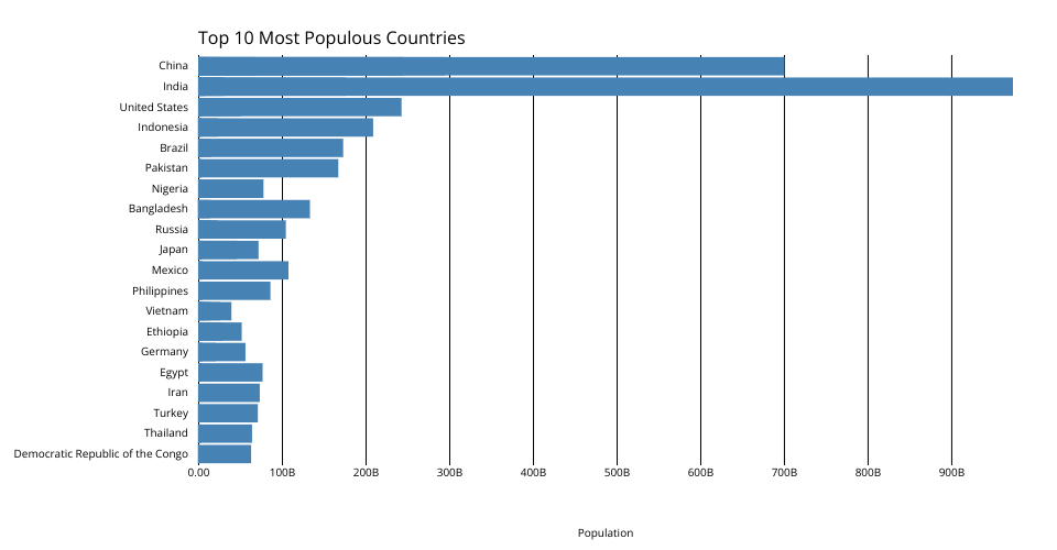 This bar chart shows population of the top 10 most populous countries. The data comes from the year 2018 estimate in United Nations: World Population Prospects 2017. It also demonstrates customization of D3 axes.