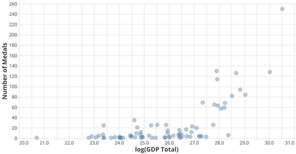 This scatter plot describes 2012 summer olympic games medal count by country and the logarithm of country's GDP(2015 estimated). x-axis is log(total GDP) y-axis is the number of medals. This is a marked scatter plot. When the mouse is hovering over the point, the country name will be displayed There is a linear relationship between GDP and the number of medals. As GDP increases, the country tends to win more medals at the summer Olympics.