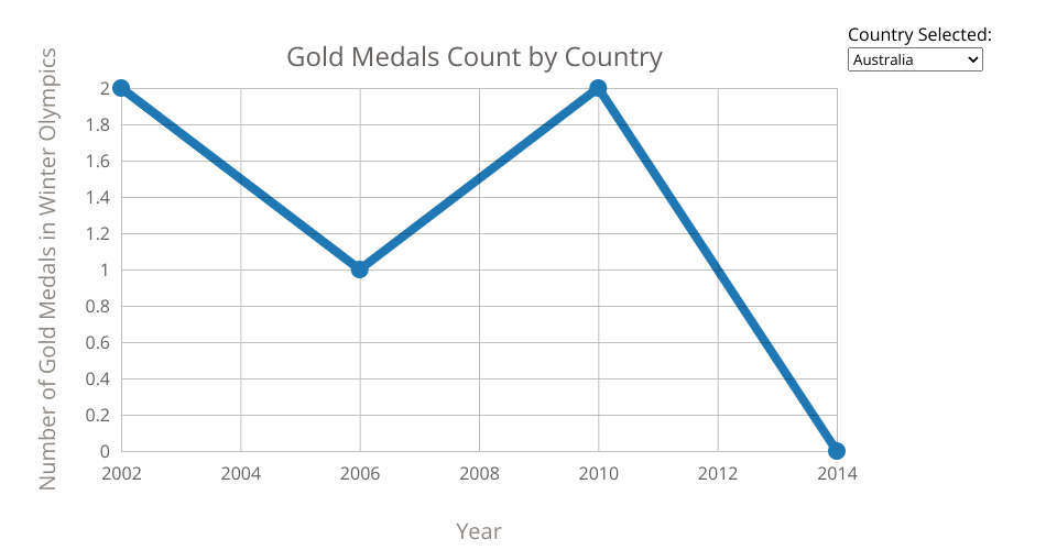It shows the number of gold medals in the Winter Olympics for a particular country from 2002 to 2014. It aims to highlight the changes in the number of gold medals in the Winter Olympics in various countries. The data is collected by olympic data. This line refers to the trend of the number of gold medals. The user can use the menu to select the country. The data is extracted from kaggle.