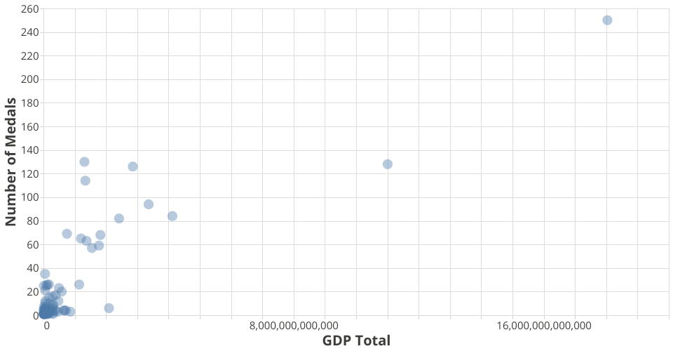 This scatter plot describes 2012 summer olympic games medal count by country and the country's GDP(2015 estimated). x-axis is gdp y-axis is the number of medals. This is a marked scatter plot. When the mouse is hovering over the point, the country name will be displayed There is a linear relationship between GDP and the number of medals. As GDP increases, the country tends to win more medals at the summer Olympics.