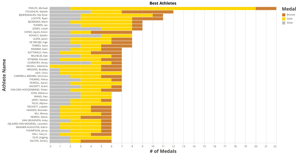 This bar chart shows the top athletes and their medals. It's designed to emphasize the top athletes in olympic games which data is collected by olympic data. Each bar references an athlete.This is an interactive bar chart. When your mouse is pointed at the athlete's bar, it will display the athlete's name, the year of the medal and the event in which the medal was awarded.