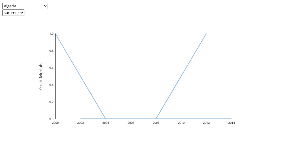 It shows the number of gold medals in the Olympics for a particular country from 2000 to 2014. It aims to highlight the changes in the number of gold medals in the Olympics in various countries. The data is collected by olympic data. The lines refer to the trend of the number of gold medals. There are two lines on the plot. One is the summer medal count, the other is the winter medal count. The user can use the menu to select the country. The season menu can be selected to see the highlighted line in red.