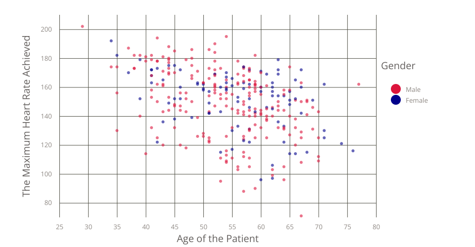 This is a scatter plot about how the age of the patient affect the maximum heart rate in the dataset. The original dataset comes from Kaggle Dataset: Heart Disease UCI