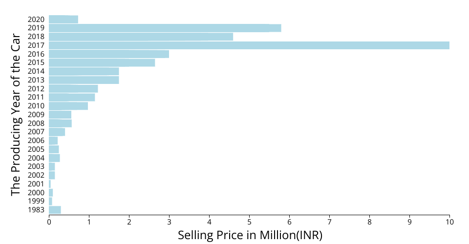 This is a bar chart about how the car's selling price corelated to it's producing year. Gist[https://gist.github.com/RyanYun0017/50ece33c48c959e86c1d3840b9ac811f]