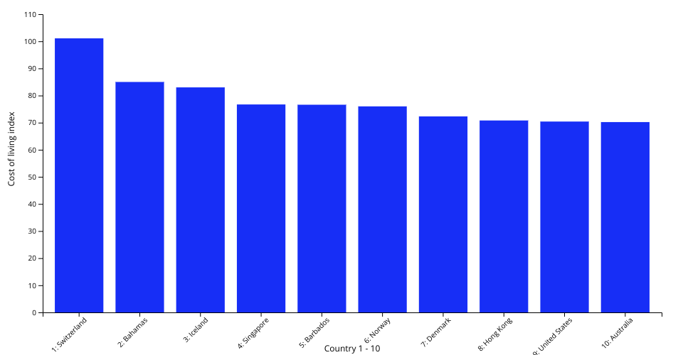 A simple bar graph with D3 showing the Cost of Living Index by Country 2024 Dataset. Top 10