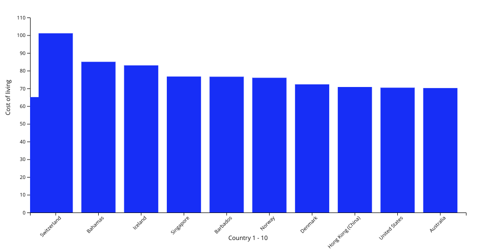 A simple bar graph with D3 showing the Cost of Living Index by Country 2024 Dataset. Top 10
