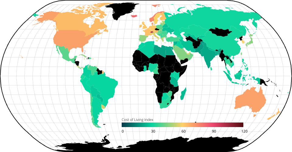 World map showing cost of living index per country. Countries with a high cost of living index are represented by dark red where countries with a low cost of livin and reoresented by dark green. Map also includes country selection where a radar chart will appear breaking down attributes that make up a country's cost of living.