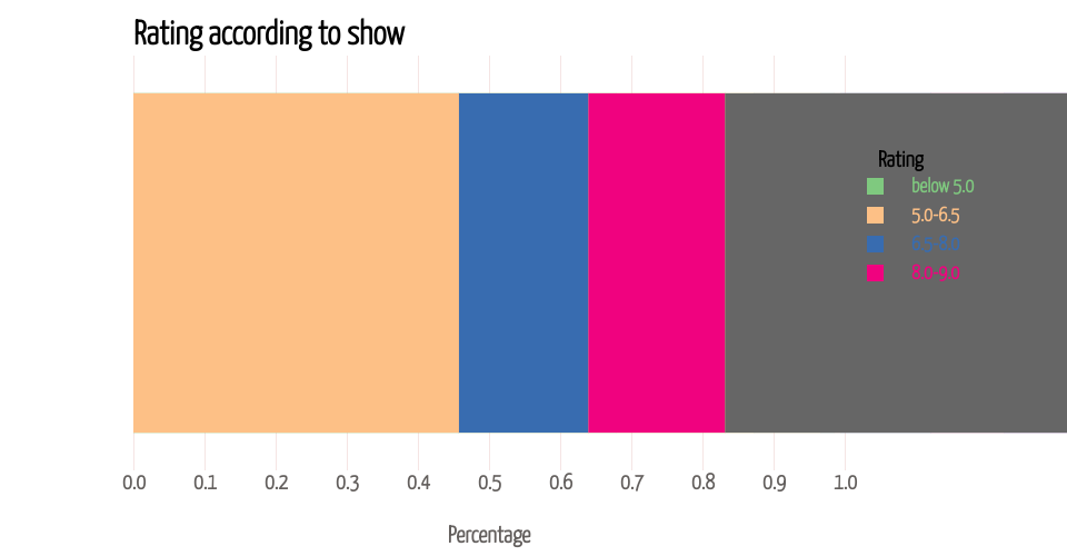 This stacked bar chart gives the percentage of each rating level within different movie genres. The aim is to show the impact of genre on movie ratings. When the mouse hovers over each bar, you can see pop-ups of accurate percentage of each rating level within each genre. Total percentage is 1, representing 100%.