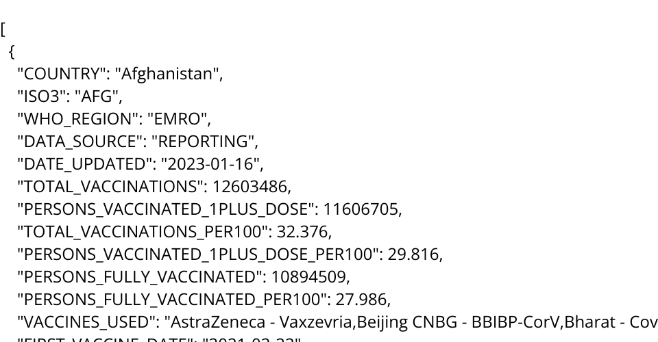 DATE_UPDATED Date Date of last update TOTAL_VACCINATIONS Integer Cumulative total vaccine doses administered