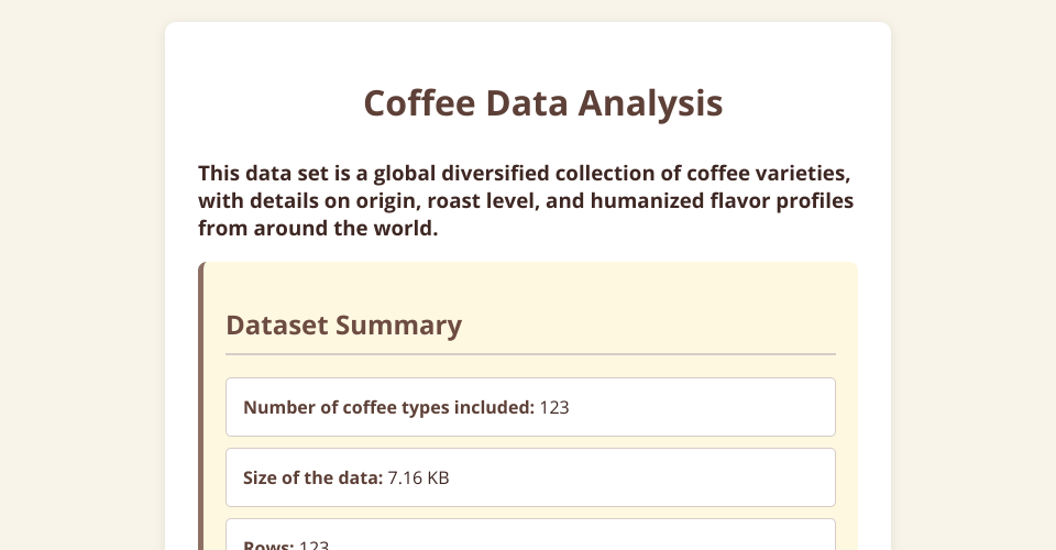 My project involves creating a custom dataset and plotting it on an HTML webpage. I created a dataset for popular coffee types, like origin, roast level, and flavor profile. I put this data out in the open on GitHub Gists to obtain a permanent URL. I used VizHub to build an HTML webpage that uses the D3.js library to access and load this CSV data. The page performs calculations on the data to display an overview (like the quantity of coffees and unique origins) and displays the information of each coffee listed. I have also created the page with a coffee-themed color scheme via CSS and added a personalized hand-drawn SVG coffee mug image to enhance the visualization's appearance.