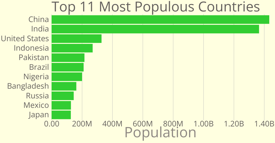This bar chart shows population of the top 10 most populous countries. The data comes from the year 2019 estimate in United Nations: World Population Prospects 2020.