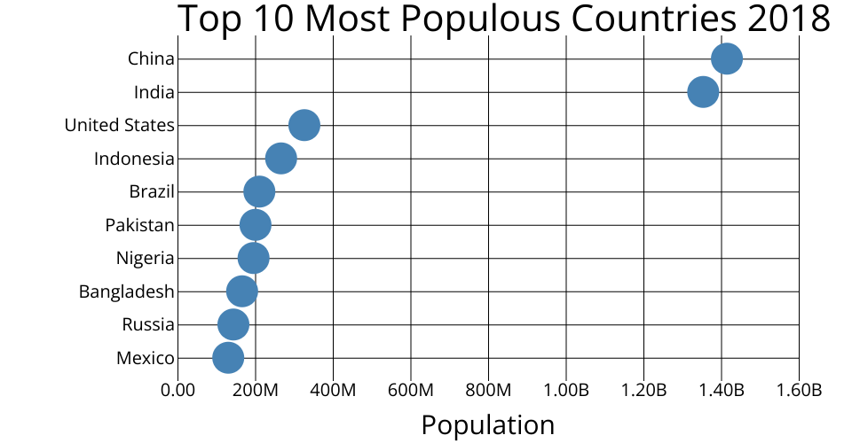 This scatter plot shows population of the top 10 most populous countries. The data comes from the year 2018 estimate in United Nations: World Population Prospects 2017. It also demonstrates customization of D3 axes.