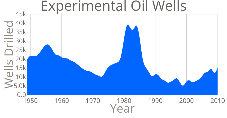 This area chart shows the number of crude oil experimental wells drilled in the U.S by year. The data comes from U.S. Energy Information Administration