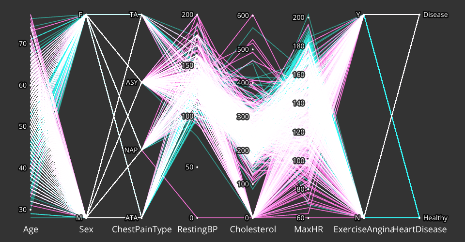 This visualization project not only demonstrates the power of Parallel Coordinates for exploring multidimensional datasets but also highlights key insights into heart disease prevalence and its relationship with various clinical parameters. By allowing users to interact with the data, it fosters a deeper understanding of the complex factors that contribute to heart health.