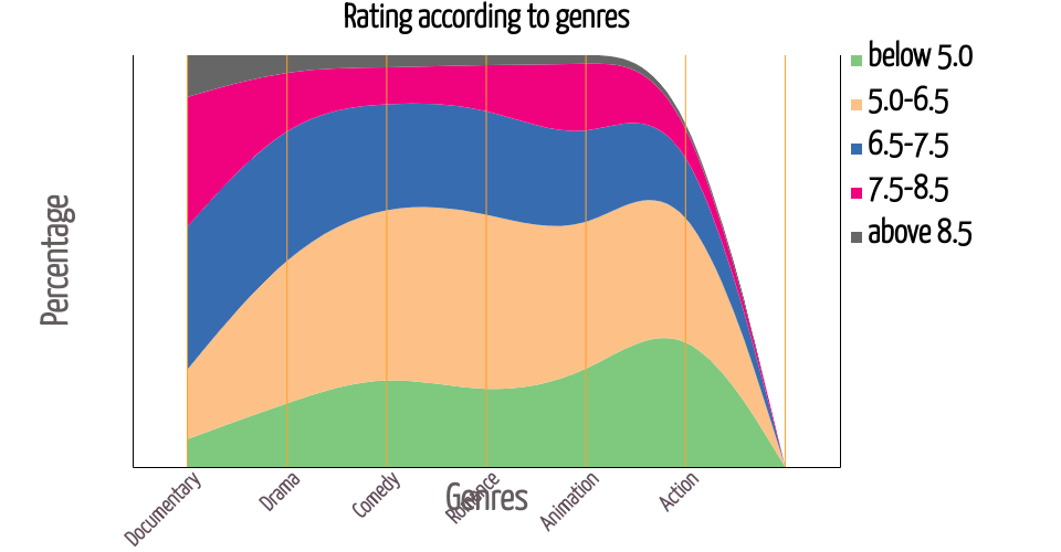 This stacked bar chart gives the percentage of each rating level within different movie genres. The aim is to show the impact of genre on movie ratings. When the mouse hovers over each bar, you can see pop-ups of accurate percentage of each rating level within each genre. Total percentage is 1, representing 100%.