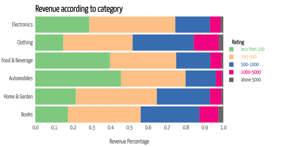 This stacked bar chart gives the percentage of each revenue of different categories. The aim is to show the revenue of different categories in a stacked bar visual. When the mouse hovers over each bar, you can see pop-ups of accurate percentage of each revenue percentage of different categories. Total percentage is 1, representing 100%.