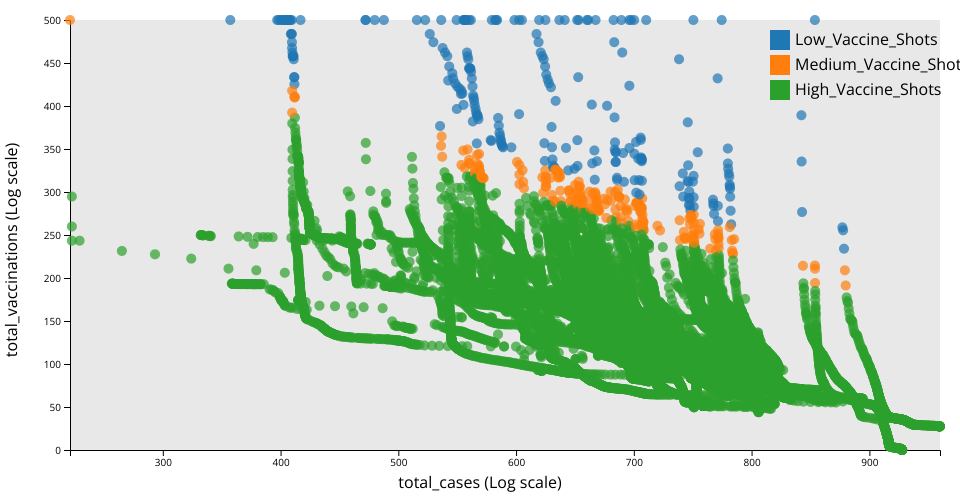 A scatter plot with D3 showing between total cases of covid and total vaccinations of covid.