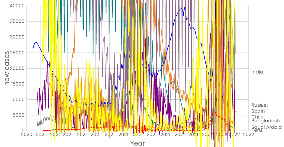 This visualization helps to see country wise line graph of new covid cases data with focus on hover over country name Covid Data is taken from The Covid Dataset File.