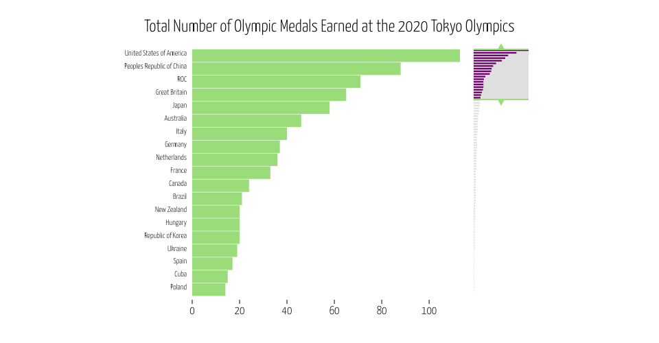 This is a brushable bar chart presenting the total number of Oylmpic medals earned by a country in the 2020 Tokyo Olympics