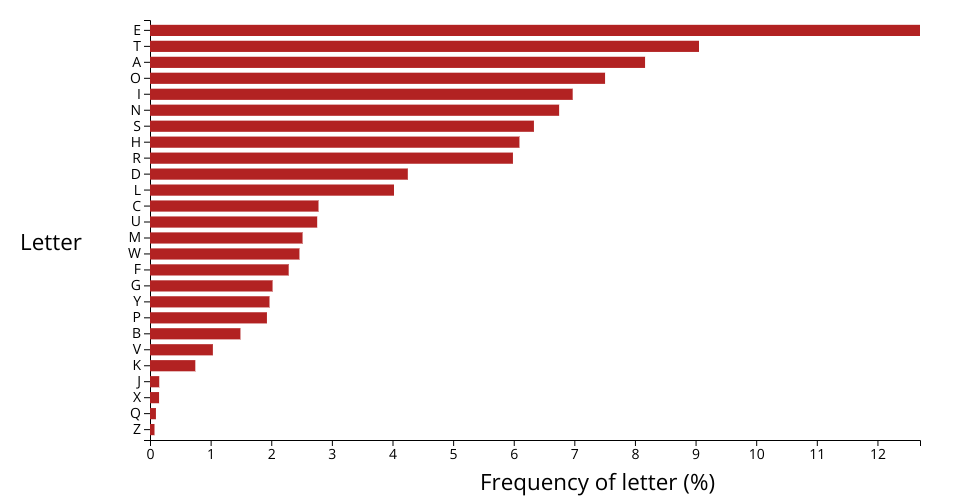Bar chart of use frequency of letters in the English language. The data came from a StackOverflow post about getting data for d3 from an array rather than a csv file: https://stackoverflow.com/questions/21639305/d3js-take-data-from-an-array-instead-of-a-file