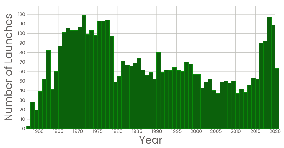 This chart meant to show the answer to "Total Number of Rockets Throughout The Years". The Y-axis is the number and X-axis shows the year.