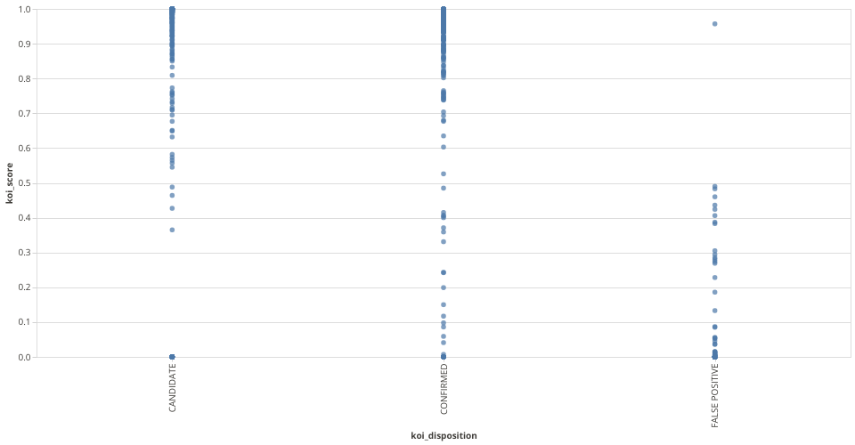 The attribute "koi_score is a value between 0 and 1 that indicates the confidence in the KOI disposition. For CANDIDATEs, a higher value indicates more confidence in its disposition, while for FALSE POSITIVEs, a higher value indicates less confidence in that disposition".