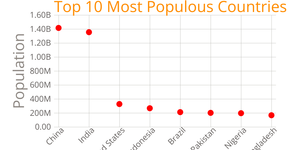 This bar chart shows population of the top 10 most populous countries. The data comes from the year 2018 estimate in United Nations: World Population Prospects 2017. It also demonstrates customization of D3 axes.