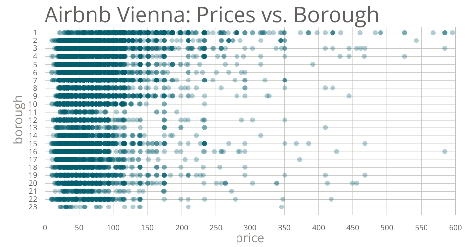 This scatter plot shows the prices for an Airbnb apartment in Vienna per borough. Source: http://insideairbnb.com/vienna/
