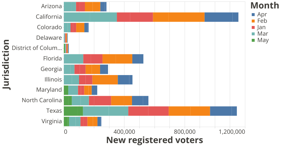 Observation: Number of new voters seems to be proportional to the total population in the state. The visualistion shows the number of newly registered voters in each state divided based on month. The Newly registered voters dataset contains how many newly registered voters were recorded for each month in some states of the U.S.A.