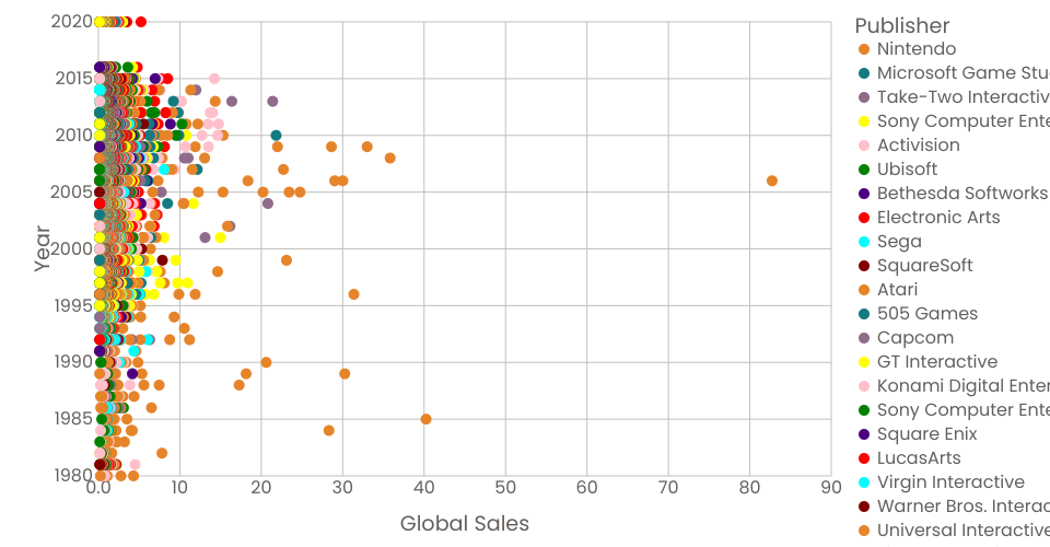 A scatter plot of Videogames sales dataset. Here, the global sale is plotted against the year sold with an interactive legend showing which publisher the game belongs to. We can observe some interesting trends.
