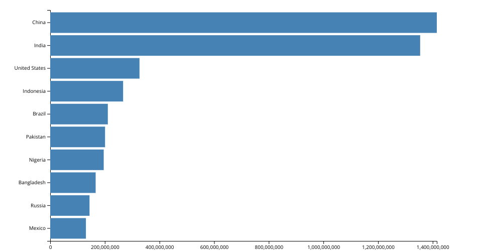 This bar chart shows population of the top 10 most populous countries. The data comes from the year 2018 estimate in United Nations: World Population Prospects 2017. It also demonstrates customization of D3 axes.