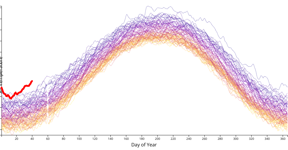 A visualization of Daily Surface Air Temperature, colored by year, with 2024 highlighted in red. Made in collaboration with EJ Fox, leveraging data prepared by Matthias Stahl.
