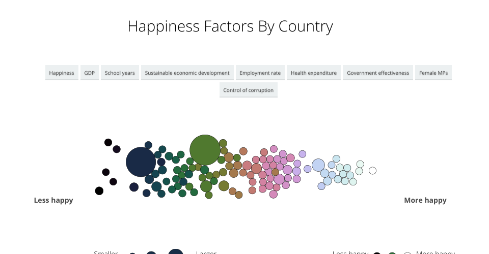 A country’s overall happiness score is a composite of different factors collected in an annual worldwide survey, including GDP per capita School years Sustainable economic development Employement Rate Health expenditure Government effectiveness Female MPS Control of corruption